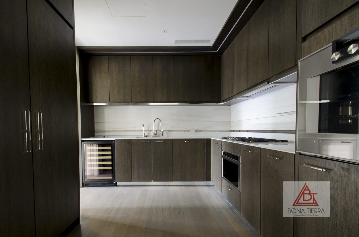 The kitchen is designed for both serious cooking and effortless hosting, outfitted with premium Gaggenau appliances, a Dornbracht faucet with filtered instant hot and cold water, a U-Line wine refrigerator, and sleek Caesarstone countertops paired with a timeless Bianco Dolomiti marble backsplash.